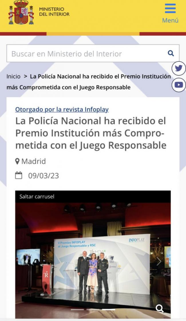 El MINISTERIO del INTERIOR emite nota de prensa acerca de la Gala Benéfica de los PREMIOS INFOPLAY al Juego Responsable