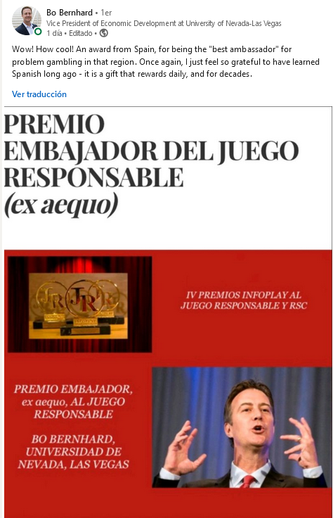 Su reconocida labor de investigación, divulgación y docencia en juego responsable en múltiples sectores. Por su larga trayectoria profesional, sus tesis doctorales en la materia, y su recorrido internacional para impartir conocimientos del juego en su faceta de industria sostenible. Por ser socio fundador de la Alianza Internacional por el Juego Responsable y hacer del juego una materia de estudio muy codiciada por los profesionales de la industria global.