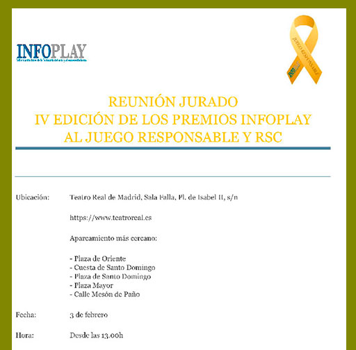 El prestigioso jurado de la Cuarta Edición de los Premios INFOPLAY al Juego Responsable y RSC se reunirá el próximo 3 de febrero para deliberar y escoger a los galardonados de once categorías que premian las buenas prácticas de la industria.